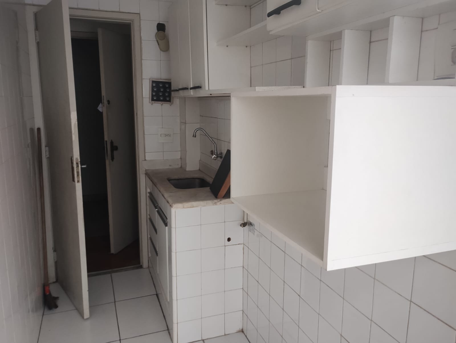 Apartamento com 43 m², sala, quarto, cozinha com armários, banheiro sociual e áreade serviço.